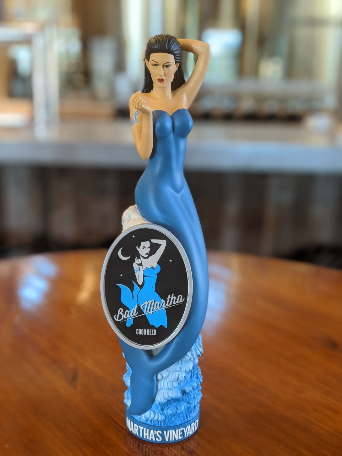 The Bad Martha tap handle is a custom build and very unique and eye-catching. The tap handle depicts Bad Martha herself beckoning and perched on a rock surrounded by the sea. The words Martha's Vineyard surround the reinforced base.